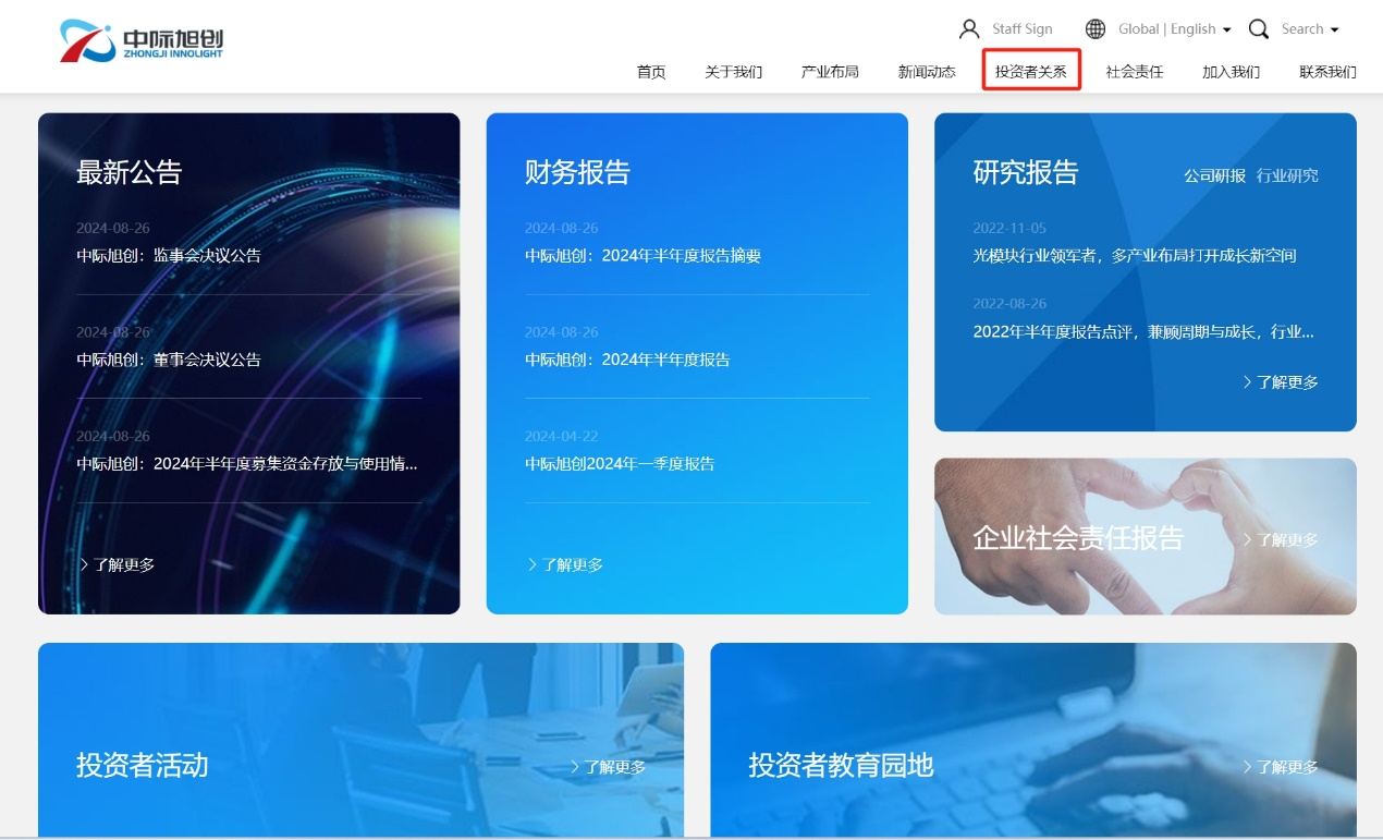 圖為中際旭創(chuàng)官網投資者關系板塊